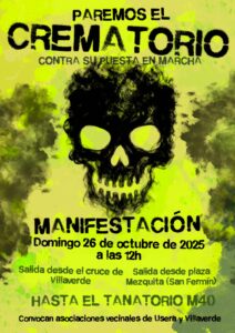 Por ello, convocamos a una manifestación el próximo domingo 26 de octubre con salida a las 12:00 desde el Cruce de Villaverde y desde Plaza los Ojos de la Mezquita (San Fermín) para confluir en el tanatorio de la M40 y exigir la denegación de la licencia.