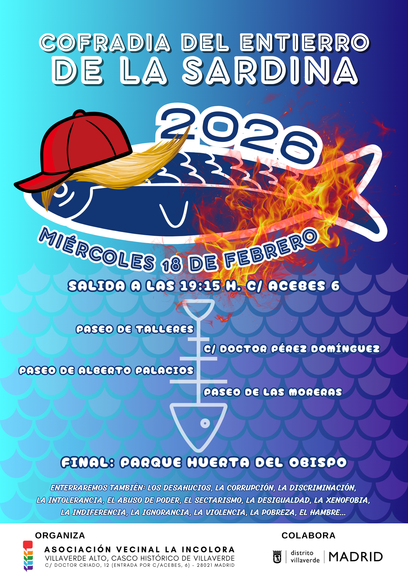 El cortejo fúnebre saldrá a las 19.15 de la tarde, desde el local de la asociación, calle Acebes 6, y recorrerá diferentes calles del barrio hasta llegar al Parque Huerta del Obispo donde se procederá a la quema de la sardina.