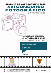 Cinco. Las fotografías serán presentadas, hasta el 10 de Noviembre de 2025, en mano o por correo en la dirección: Asociación Vecinal ” La Incolora” de Villaverde Alto (los lunes de 19 a 20,30 Horas) calle Acebes 6, 28021-Madrid, y en la Librería Pueblos y Culturas c/ Gilena 1, en horario de comercio.