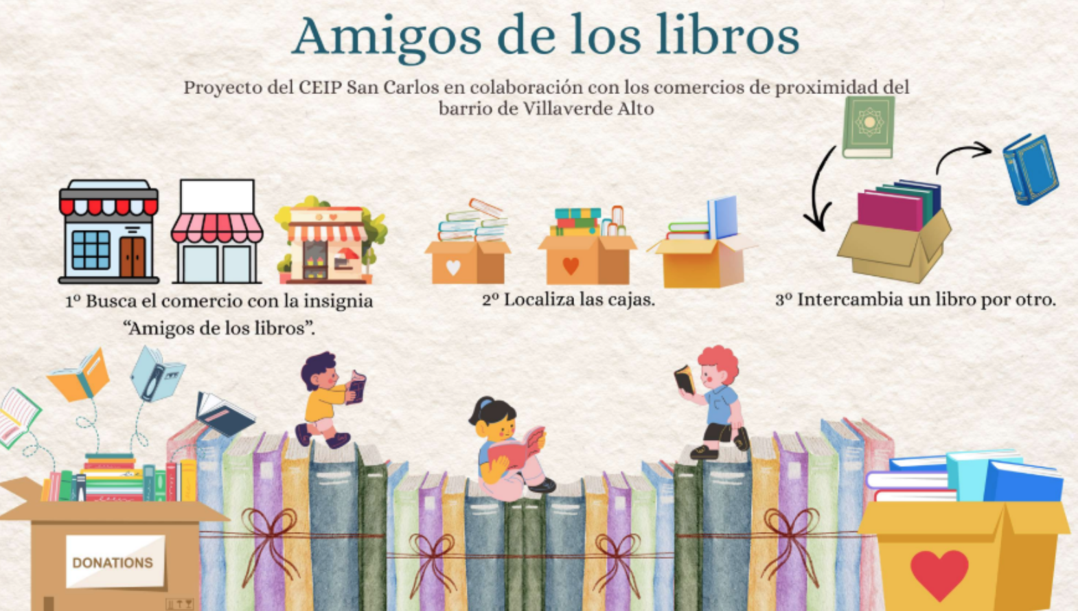 Nuestro propósito consiste en animar a algunos comercios próximos al colegio a que colaboren con nuestros alumnos que, con gran ilusión, les visitarán con sus maestros para explicarles el proyecto. Los comerciantes solo tendrán que aceptar, el día 23 de abril, una caja con libros y cuentos donados obteniendo así la insignia de Amigos de los Libros que podrán lucir orgullosos en el escaparate de su local y de esta manera poder ser localizados por los vecinos. Los niños del barrio podrán acceder a esta pequeña biblioteca cogiendo un libro cuando la visiten y dejando a su vez libros que tengan en casa y que ya han leído, con el objetivo de mantener siempre vivos estos pequeños rincones literarios.