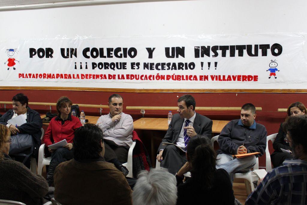 Después, y tras un paseo por la zona, Tomás Gómez se reunió en la sede de la Asociación de Vecinos Los Rosales con representantes de diversas entidades que componen la Plataforma: las asociaciones de madres y padres de los CEIP Navas de Tolosa, Barcelona, Cristóbal Colón, Juan de la Cierva, Los Rosales, Ausías March y El Greco; de los IES San Cristóbal, Ciudad de los Ángeles y El Espinillo, y del Colegio Europa; de las asociaciones de vecinos ASVEYCO, El Espinillo, Oroquieta, San Nicolás, La Unidad de San Cristóbal, La Incolora y Los Rosales; y de la Delegación de la FAPA Giner de los Ríos en Villaverde. El encuentro, que duró dos horas, puso de relieve la mala situación que vive el distrito con respecto al tema educativo: falta de infraestructuras, pésimo mantenimiento de algunos centros, masificación o falta de respuesta de las administraciones. Además se trataron otros aspectos relacionados con el distrito y la comunidad de Madrid como la situación de la sanidad pública, el desequilibrio social o los problemas del tejido industrial madrileño, así como del tejido asociativo y la participación ciudadana a quienes se estrangula con desaparición de órganos de participación y con la falta de ingreso de subvenciones concedidas, imposibilitando la ejecución de acciones para su justificación y provocando así su reintegro, en una iriente burla a la participación y a la Ley.